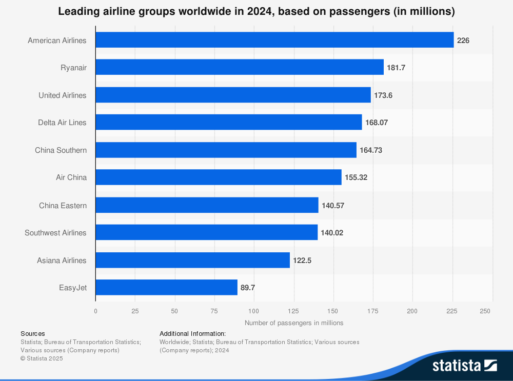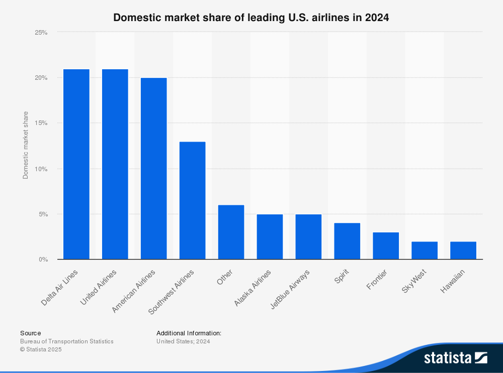 The airline sector is a dynamic and highly competitive industry, exemplified by the diverse operational scales and market reach of its leading carriers. In global terms, United Airlines (UAL) stands among the top contenders, carrying nearly 174 million passengers in 2024, positioning it just behind American Airlines and Ryanair and ahead of Delta Air Lines and major Asian carriers. Domestically, UAL holds one of the largest shares of the U.S. market, closely competing with Delta and American Airlines, each capturing just over 20% of the market. JetBlue Airways (JBLU) and SkyWest (SKYW), while significantly smaller than UAL, demonstrate the sector’s diversity: JetBlue carves out a notable niche with roughly 5% market share focused on hybrid low-cost service, whereas SkyWest operates with a regional business model and holds about a 2% share, supporting major airlines through contract flying and serving less densely populated routes.