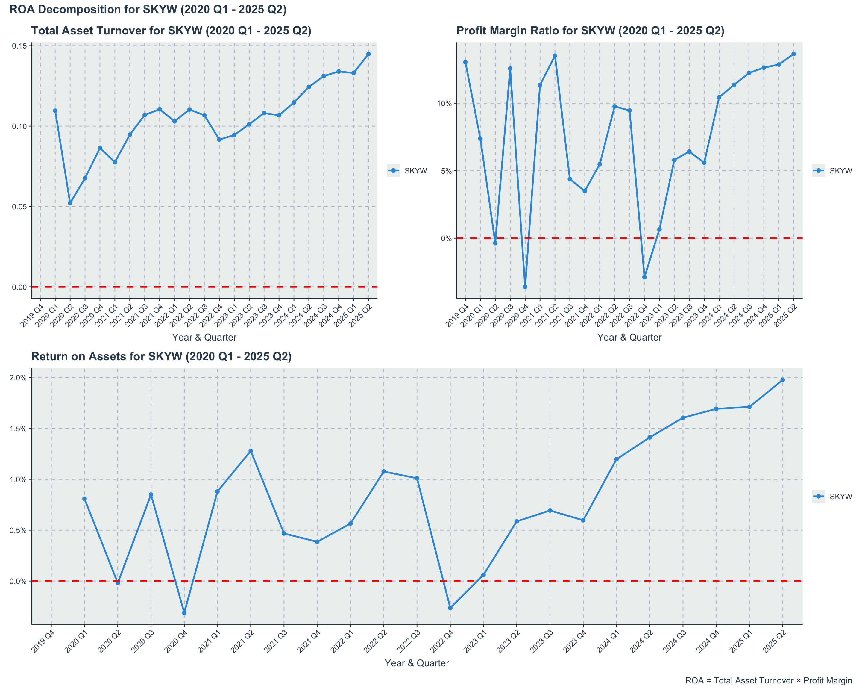 ROA decomposition provides valuable insights into the drivers of SkyWest’s asset efficiency. By breaking down ROA into Total Asset Turnover and Profit Margin, we can better understand how effectively the company utilizes its assets to generate revenue and how efficiently it converts that revenue into profit. This analysis highlights the dual importance of operational efficiency and profitability in enhancing SkyWest’s overall return on assets.